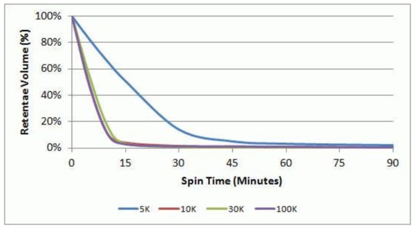 Protein samples for each MWcO (5K, 10K, 30K, 100k at approximately 0.25 mg/mL starting concentration were centrifuged in 20-100 mlPierce Protein Concentrators PES at 1200x g for 90 min to determine the protein concentration rate. For 10K, 30K, and 100K MCOs, >90%of the protein solution was concentrated within 15 min, for the 5K MWCO, this degree of concentration occured within 90 min. |
