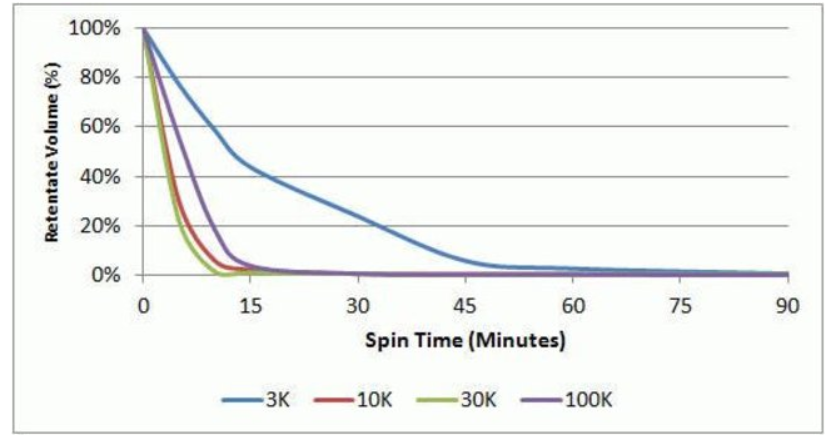 Protein samples for each MWCO (3K, 10K, 30K, 100K) at approximately 0.25 mg/mL starting concentration were centrifuged in 5-20 mL PierceProtein Concentrators PES at 5,000x g for 90 min to determine the protein concentration rate. For 10K, 30K, and 100K MWCOs, >90% of theprotein solution was concentrated within 15 min; for the 3K MWCO, this degree of concentration occured within 90 min. |