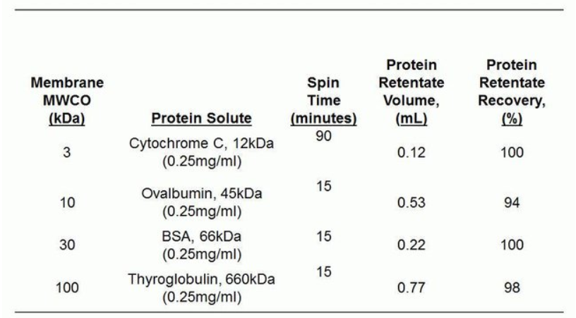 •快速蛋白浓缩—可在 5-30 分钟内将 10K MWCO 的样品浓缩 10 至 30 倍(不同 MWCO 的产品所用时间可能不同)