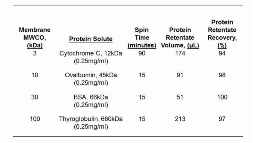 •快速蛋白浓缩—可在 5-30 分钟内将 10K MWCO 的样品浓缩 10 至 30 倍(不同 MWCO 的产品所用时间可能不同)