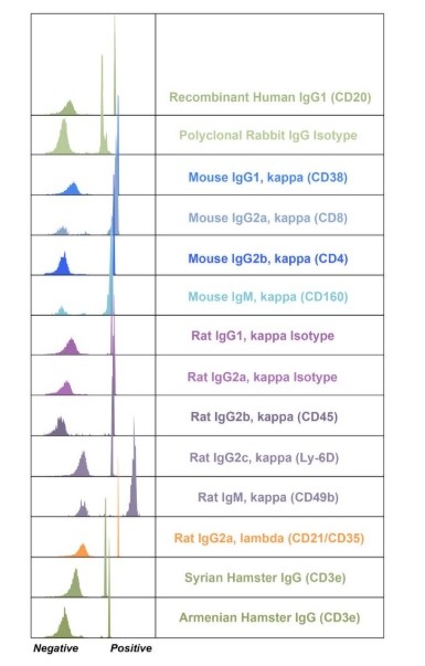 每滴微珠包含两种群体:可与小鼠、大鼠、仓鼠、兔或重组人抗体结合的阳性群体,不会与抗体结合的阴性群体。在向微珠中加入荧光染料结合抗体时,会同时观察到阳性和阴性群体。进行多色流式细胞分析实验时,这种双峰分布可用于制备单色补偿对照品,以准确设置仪器。