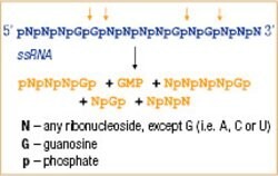 RNase T1 是一种核糖核酸内切酶,可特异性降解在 G 残基处的单链 RNA。其通过形成相应的中间体 2', 3'-环磷酸盐,切割相邻核苷酸的 3'-鸟苷残基和 5'-OH 残基之间的磷酸二酯键。反应产物为 3'-GMP 和含末端 3'-GMP 的寡核苷酸。