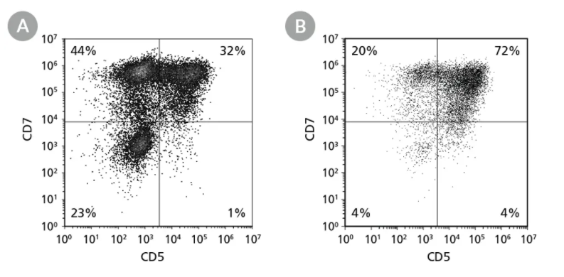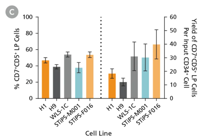Figure 4. hPSC-Derived CD34+ Cells Differentiate to CD5+CD7+ Lymphoid Progenitor Cells Over 14 Days of CulturehPSC-derived CD34+ cells were cultured for 14 days in StemSpan™ Lymphoid Progenitor Expansion Medium on plates coated with StemSpan™ Lymphoid Differentiation Coating Material (Figure 2). Cells were harvested and analyzed for CD7 and CD5 expression by flow cytometry. Representative flow cytometry plots for (A) ES (H1) cell-derived and (B) iPS (STiPS-M001) cell-derived cells are shown. (C) The average frequency of viable CD7+CD5+ lymphoid progenitor cells on day 14 ranged between 38% and 54%, and the average yield of lymphoid progenitor cells produced per input hPSC-derived CD34+ cell was between 12 and 40. Data are shown as mean ± SEM (n = 8 - 32).