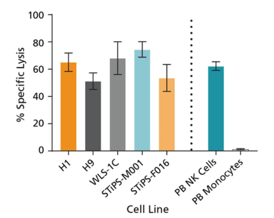 Figure 7. Cultured NK Cells Exhibit Cytotoxicity Toward K562 Cell LinehPSC-derived CD56+ NK cells were co-cultured with calcein AM (CAM)-labeled K562 cells at a ratio of 2.5:1 for 4 hours. Isolated peripheral blood (PB) NK cells and monocytes were also co-cultured with labeled K562 cells as positive and negative controls, respectively. Before the co-culture, frozen PB NK cells were thawed and cultured overnight with StemSpan™ NK Cell Differentiation Supplement and StemSpan™ SFEM II, while PB monocytes were cultured overnight in SFEM II only. To measure maximum release, the labeled K562 cells were treated with 1% Triton™ X-100. Culture supernatants were assessed for fluorescence released by dead cells after 4 hours using a SpectraMax® microplate reader (excitation 485 nm/emission 520 nm). The % specific lysis was calculated as follows: [(test release - spontaneous release) / (maximum release - spontaneous release)] x 100%. The average specific lysis by hPSC- derived NK cells ranged between 51% and 75% as compared to 62% specific lysis by PB NK cells. Cultures of ES (H1 and H9) and iPS (WLS-1C, STiPS-M001, and STiPS-F016) cells are shown. Data are shown as mean ± SEM (n = 3 - 7).