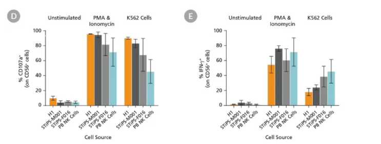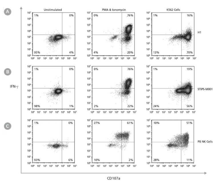 Figure 8. Cultured hPSC-Derived CD56+ NK Cells Are Induced to Express Surface CD107a and Produce IFN-γ After Co-Culture with K562 Target Cells or Stimulation with PMA and IonomycinhPSC-derived NK cells were obtained using STEMdiff™ NK Cell Kit as described. hPSC-derived CD56+ NK cells were left unstimulated or were stimulated with either phorbol 12-myristate 13-acetate (PMA) and ionomycin or with K562 cells at a ratio of 1:1 effector to target cells. CD107a antibody and stimulation factors were added to each well. After one hour, monensin and brefeldin A were added to each well to inhibit protein transport. After a total incubation time of 4 hours at 37°C, cells were washed and stained with Zombie NIR™ Fixable Viability Kit and CD56. Cells were then fixed, permeabilized, and stained for IFN-γ. Surface CD107a and intracellular IFN-γ expression were assessed using flow cytometry. Representative samples are gated on CD56. (A) Representative unstimulated, PMA & ionomycin- stimulated, and K562-stimulated ES (H1) cell-derived NK cell samples. (B) Representative unstimulated, PMA & ionomycin-stimulated, and K562-stimulated iPS (STiPS-M001) cell-derived NK cell samples. (C) Representative unstimulated, PMA & ionomycin-stimulated, and K562-stimulated PB NK cell samples. The PB NK cell sample was thawed and cultured overnight in StemSpan™ SFEM II supplemented with IL-2 prior to this assay. (D) Summary of CD107a and (E) IFN-γ expression results by NK cells. Upon stimulation, hPSC-derived CD56+ NK cells are able to degranulate, as shown by surface expression of CD107a (average range: 82 - 96% for PMA & ionomycin stimulation and 68 - 90% for K562 stimulation) and secrete IFN-γ (54 - 76% and 18 - 39% for PMA & ionomycin and K562 stimulation, respectively). Data are shown as mean ± SEM (n = 2 - 4 ). |
