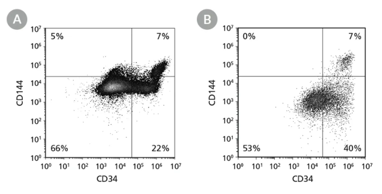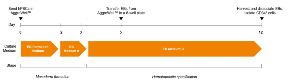 图1.STEMdiff™造血-EB祖细胞分化方案首先收集人骨髓间充质干细胞(hpscs),将其解离为单细胞悬液,随后接种于aggrewell™培养板中,使用EB形成培养基(EB培养基A+10 µM Y-27632)形成600细胞聚集体。第2天进行EB培养基A半换液。经过3天中胚层形成后,将培养基更换为EB培养基B以诱导造血谱系分化。第5天将EB转移至未经组织培养处理的培养板。12天后收集并解离EB,通过Easysep™分选试剂盒分离CD34阳性细胞。