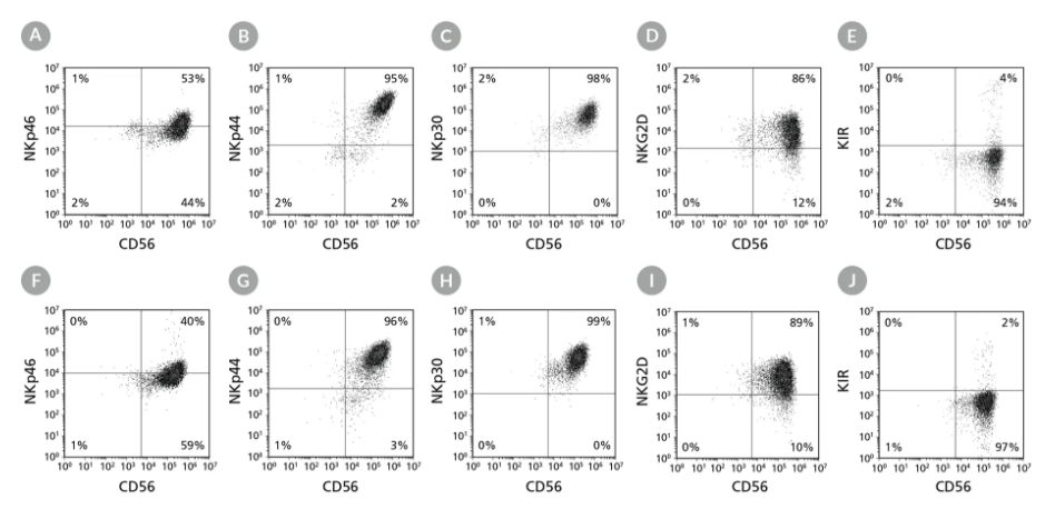 Figure 6. Cell Surface Marker Expression on PSC-Derived CD56+ NK Cells After 28 Days of CulturehPSC-derived CD34+ cells were cultured in StemSpan™ Lymphoid Progenitor Expansion Medium on plates coated with StemSpan™ Lymphoid Differentiation Coating Material for 14 days, followed by 14 days of culture in StemSpan™ NK Cell Differentiation Medium on non-coated plates to generate CD56+ NK cells (Figure 2). Cells were harvested and analyzed for CD56, NKp46, NKp44, NKp30, NKG2D, and KIR expression by flow cytometry. Dead cells were excluded by light-scatter profile and DRAQ7™ staining. Data shown are from representative cultures initiated with (A-E) ES (H1) cells or (F-J) iPS (STiPS-M001) cells.