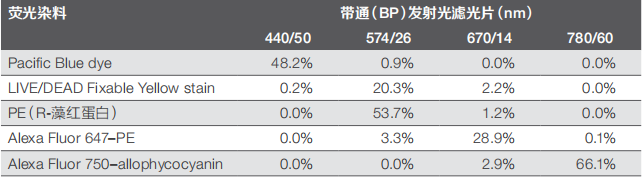表中方案是基于Attune NxT流式细胞仪的滤光片配置而设计。 百分比是指使用该滤光片检测到荧光信号的效率。比如,574/26 nm带通滤光片分别收集20.3%的LIVE/DEAD可固定细胞死活黄色染料(LIVE/DEAD Fixable Yellow Stain)荧光以及53.7%的PE荧光染料的荧光,但它们的荧光光谱实际上不会发生重叠,因为它们是由不同激光器激发的:LIVE/DEAD染色液由405 nm激光器激发而非488 nm激光器,PE由488 nm激光器激发而非405 nm激光器。 |