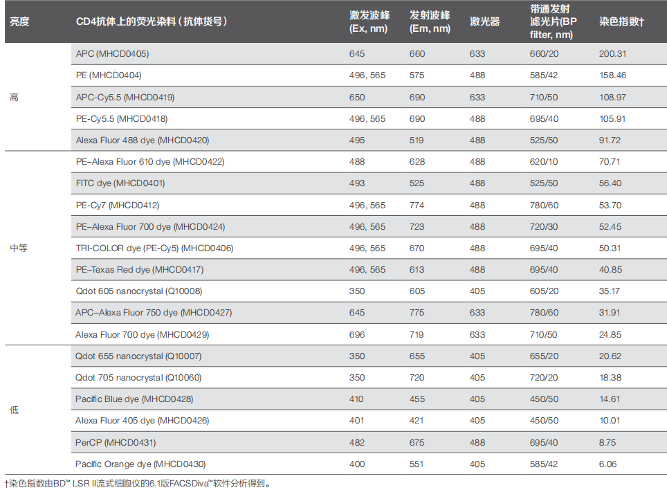 表1. 在CD4抗体(克隆号53.5)上不同荧光染料的染色指数。