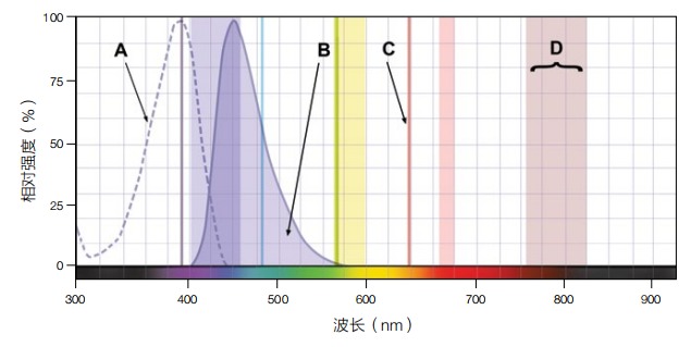 图4.荧光光谱查看器Spectra Viewer。同一荧光染料的激发光谱(A)和发射光谱(B),激光激发波长(C),带通发射滤光片波长(D)。 |