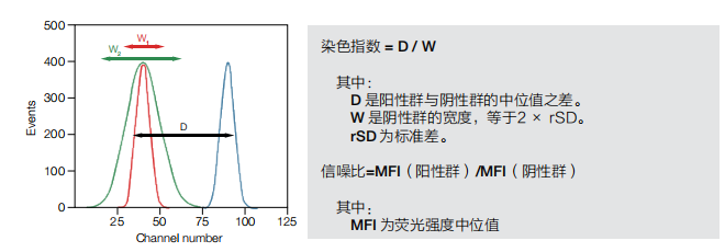 图2. 染色指数(Stain Index)和信噪比的比较。图中展示了信噪比相同的两群荧光信号,但其染色指数(Stain Index)不同,这是因为它们阴性峰的宽度不同(W1窄vs W2宽)。由于阴性峰宽度影响阳性和阴性信号的区分,因此染色指数常作为荧光染料亮度参数。 |