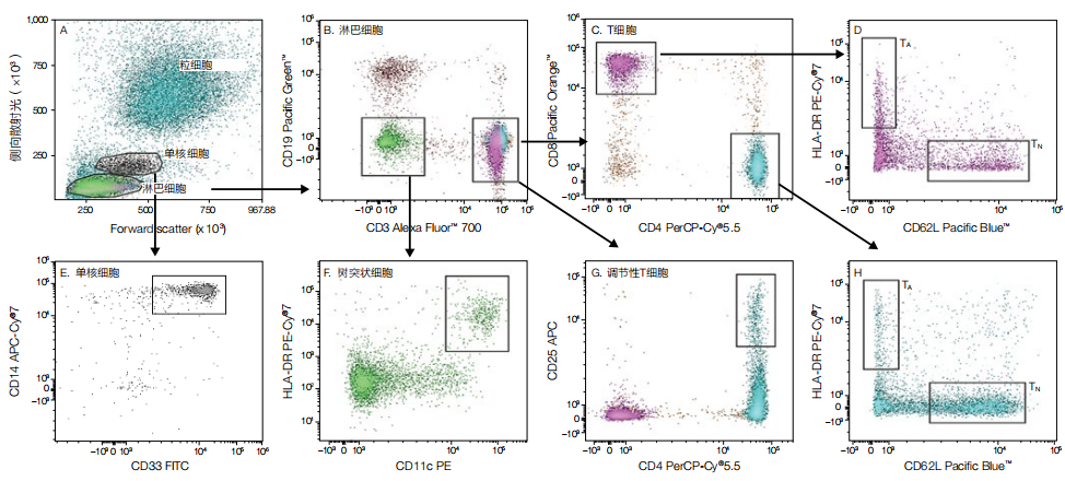 图1.使用Attune NxT声波聚焦流式细胞仪对人外周血单个核细胞(PBMC)进行10参数免疫分型检测。根据前向散射光FSC和侧向散射光SSC对淋巴细胞和单核细胞设门(A)。在淋巴细胞中根据CD3表达圈出T细胞(B),并进一步将其细分为CD4+和CD8+ T细胞亚群(C)。调节性T细胞可表达CD4和CD25(G),它是维持机体免疫耐受的重要因素。CD62L将T细胞分为初始CD4+ T细胞和初始CD8+ T细胞(TN);HLA-DR可由活化的T细胞(TA)表达(D, H)。外周血中树突状细胞通常不表达T和B细胞谱系标志,可表达CD11c和HLA-DR(F)。在散射光信号图中,单核细胞位于淋巴细胞上方(A),并且同时表达CD14和CD33(E)。 |