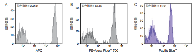 图3. 使用不同荧光染料标记的CD4抗体染色结果图。在氯化铵裂解后的人全血样本中,收集10,000个淋巴细胞,评估20种的Anti human CD4抗体性能(见表1)。为获得最大信噪比,对每种荧光抗体均进行了滴定和优化,结果为(A)CD4-APC抗体亮度最高;(B)CD4-PE–Alexa Fluor 700抗体亮度中等;(C)CD4-Pacific Blue抗体亮度很低。图片左上角有每种荧光抗体的染色指数(Stain Index)。 |
