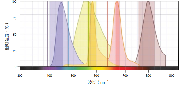 图5.荧光光谱查看器显示流式5色方案。这里使用了405 nm激光激发的Pacific Blue染料(紫色)、405 nm激光激发的LIVE/DEAD可固定细胞死活的黄色染料(黄色)、488 nm激光激发的R-藻红蛋白(PE,橙色)、561 nm激光激发的PE-Alexa Fluor 647(红色)及633 nm激光激发的APC-Alexa Fluor 750(棕色)的发射光谱。所示激光为405 nm(紫色)、488 nm(蓝色)、561nm(黄色)和633 nm(红色)。 |