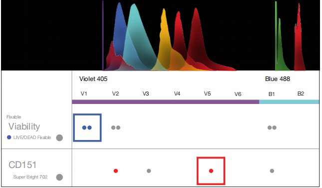 • 弱表达抗原搭配较亮荧光染料,强表达抗原搭配较弱荧光染料。