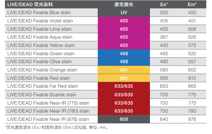 • LIVE/DEAD™ 可固定细胞活性染料(LIVE/DEAD fxable dead cell stains)(如LIVE/ DEAD™ 可固定绿色细胞活性染料试剂盒LIVE/DEAD Fixable Green Dead Cell Stain Kit [# L23101])