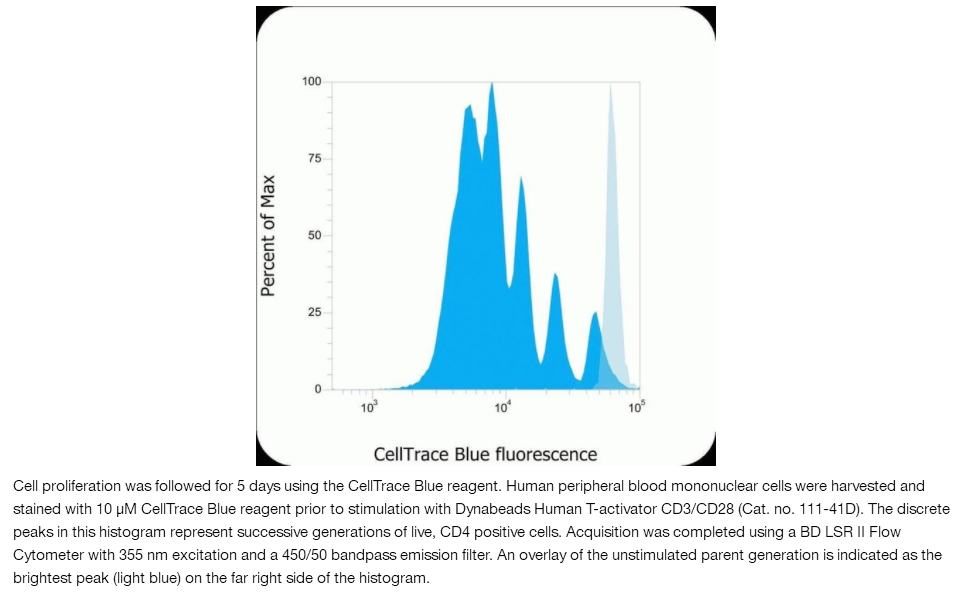 使用染料稀释法成功地进行增殖分析需要极亮的染料,来区分数次细胞分裂后的荧光标记细胞和自发荧光。CellTrace Blue 染料能产生高强度荧光染色,在细胞固有的自发荧光掩盖标记荧光信号之前,实现五代或更多代增殖细胞的可视化。一致、均匀的染色结果,群体中细胞之间的荧光变异很小,无需复杂的建模软件即可明显区分细胞代数。推荐的外周血单核细胞的工作浓度为 5–10 µM。然而,与流式细胞分析中使用的所有试剂一样,为获得极佳信号,强烈建议试剂滴定。