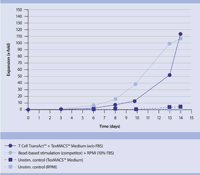 T cell activation via CD3 and CD28 with T Cell TransAct™. This stimulation reagent is ready-to-use for in vitro activation and expansion of human T cells. Its polymeric nanomatrix structure ensures gentle and efficient activation of resting T cells from PBMCs and of enriched T cell populations, while maintaining high viability. |